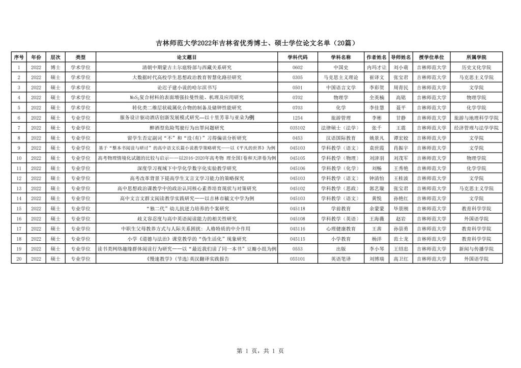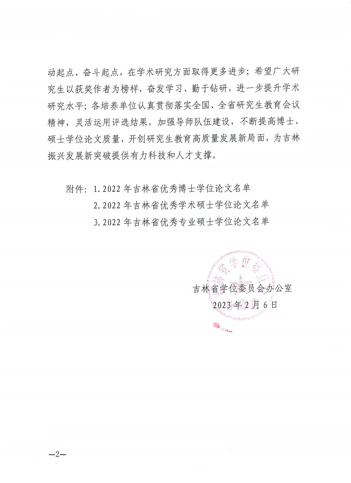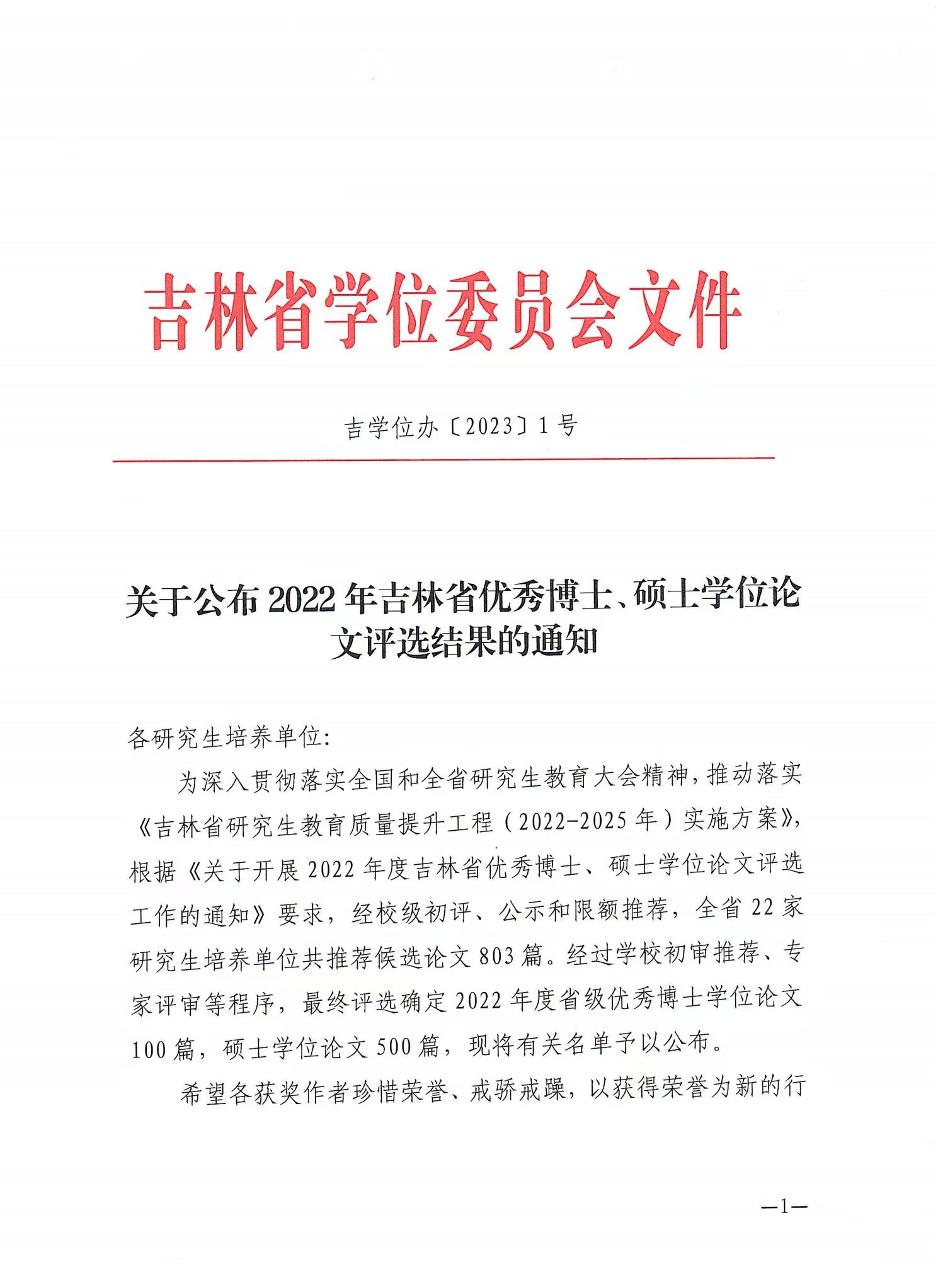 我院学生毕业论文入选2022 年吉林省优秀博士、硕士学位论文