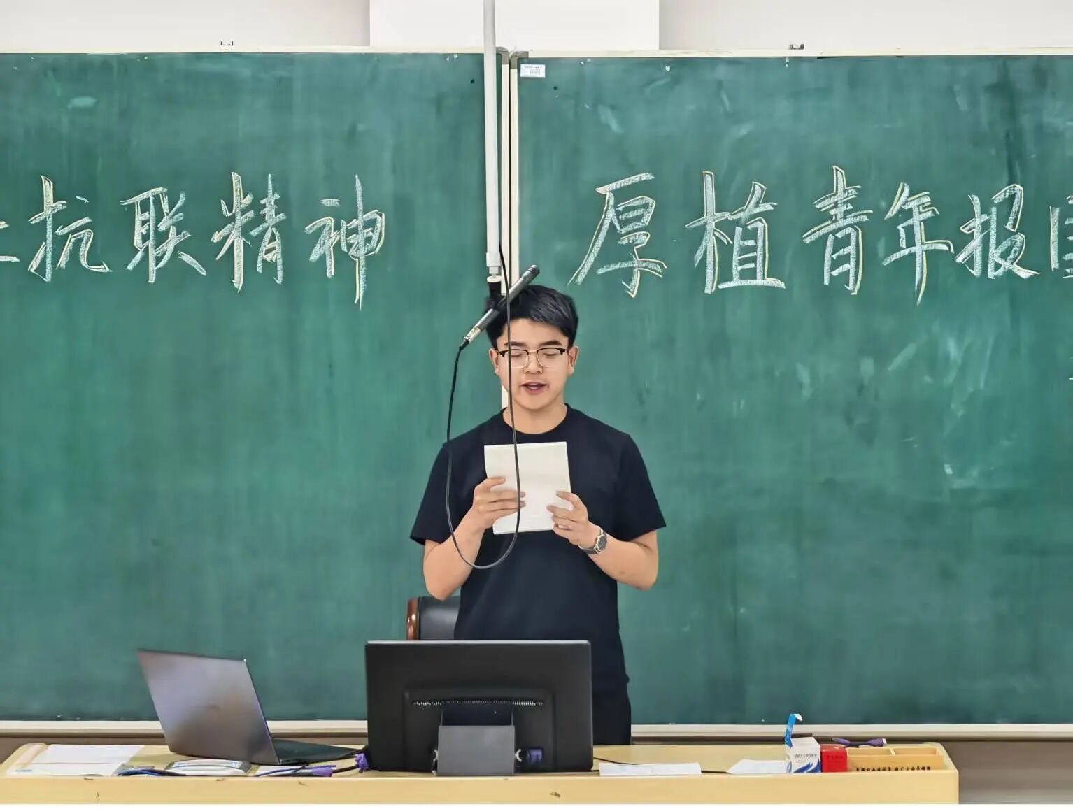 物理学院党委副书记徐海波在参与班会时谈到:“‘杨靖宇支队’战旗从抗战胜利80周年阅兵式的荣光,到荣归吉林故里,这面浸染着热血的旗帜,不仅是历史的见证,更是唤醒青年使命的精神火炬。我们要将抗联精神融入日常育人,引导学生以坚韧品格攻克学业难关,用家国情怀锚定人生方向,让红色精神在青春奋斗中焕发光彩。”