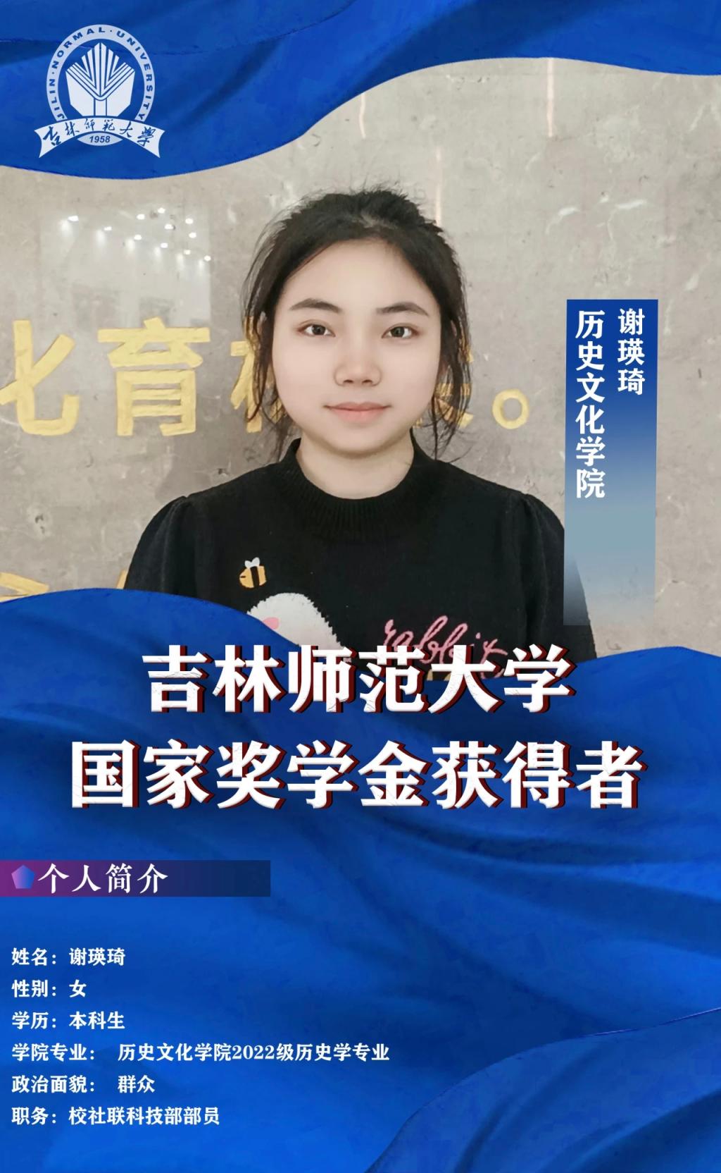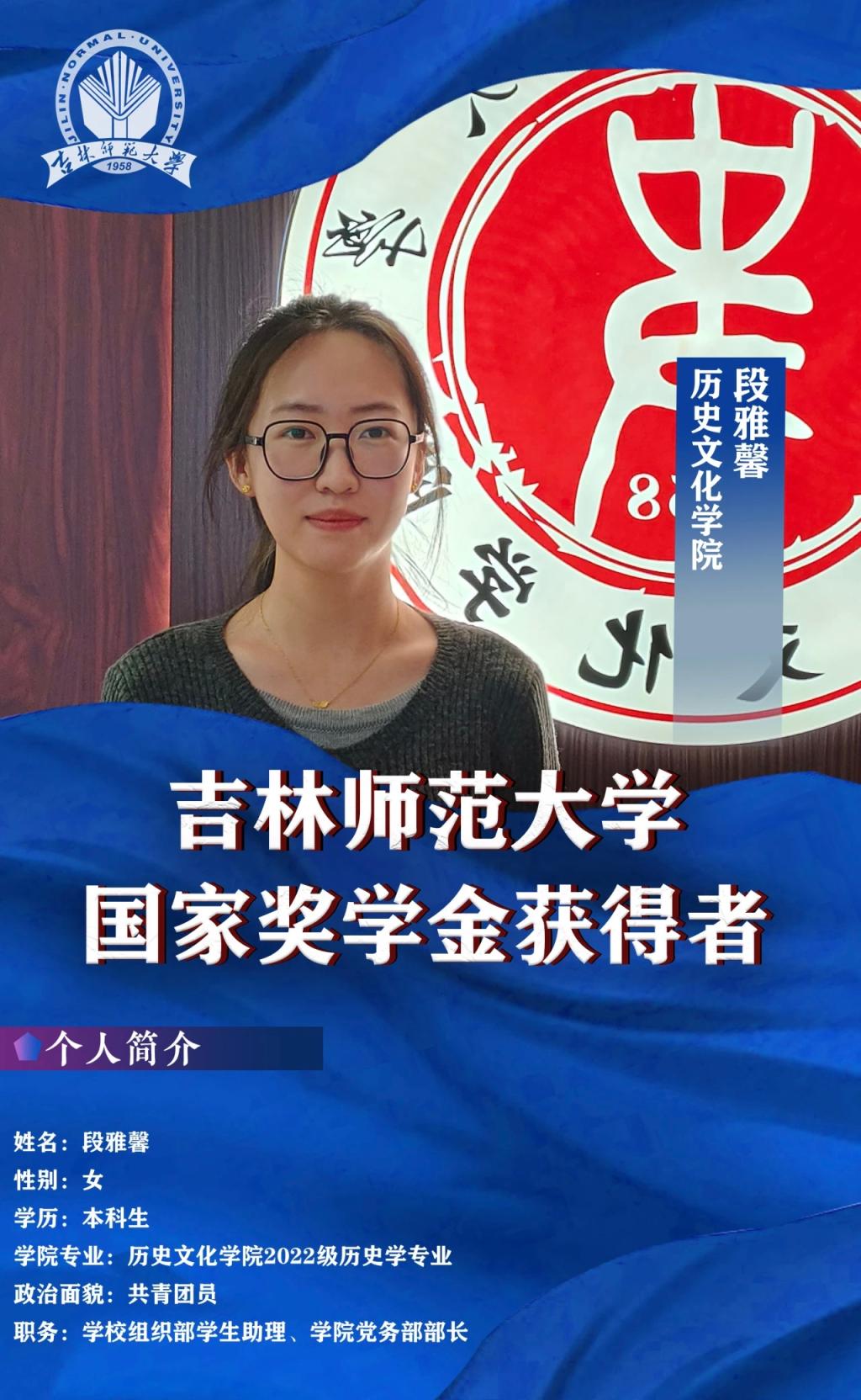 在专业学习方面,段雅馨同学始终保持严谨的学习态度,脚踏实地,综合成绩位列年级第二名,多次获得一等专业奖学金和“三好学生”等荣誉称号。积极参加21世纪杯英语演讲比赛、第19届“挑战杯”红色专项项目、“互联网+”大学生创新创业大赛等活动,提升个人能力。她负责的“各美其美,美美与共——辽代器物所见‘中华’文化认同”项目,获2024年全国大学生创新创业训练计划项目省级立项。项目公众号“大辽器韵”通过对历史器物的深入探究,增强公众对中华文化的认同感和自豪感,目前已有百余人次参与。