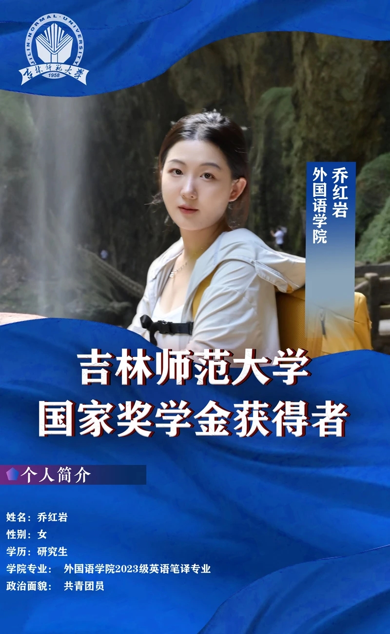 乔红岩同学是吉林388vip太阳集团的一名优秀学子,她以扎实的学术基础、坚韧的奋斗精神和广泛的社会实践,成为同学们的榜样。在教育、翻译和志愿服务等领域,她取得了显著成绩,展现了独特的才华和担当。