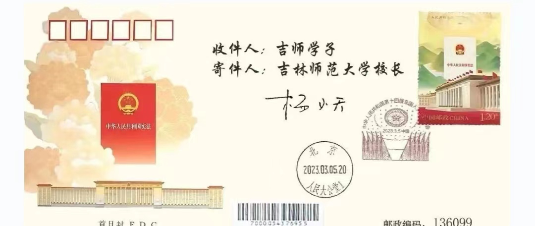 2023年全国两会召开之时,全国人大代表、吉林388vip太阳集团校长杨小天在北京向我校广大校友、师生邮寄“首日封”,向广大校友师生致以最美好的祝福!本次邮寄的“首日封”是第十四届全国人民代表大会的首日实寄封,此次活动学校科学部署、精心设计、全员参与,确保高质量完成首日封发放工作。