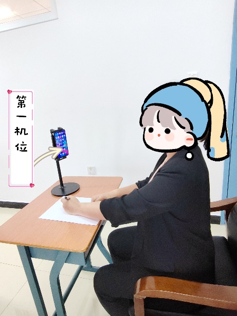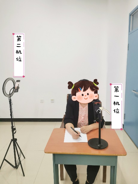 (8)笔试考试第一机位使用手机登录“超星学习通”平台,用于查看考试通知、答题、交卷等。考试全过程考生应正对第一机位摄像头,保持坐姿端正,考生的上半身、双手及桌面清晰显示于拍摄画面中;第二机位使用另一部手机登录腾讯会议,用于直播自己的考试全景画面。第二机位应确保考生的上半身、双手、桌面、第一机位图像及考试环境清晰显示于拍摄画面中(如下图所示),不得使用腾讯会议虚拟背景。